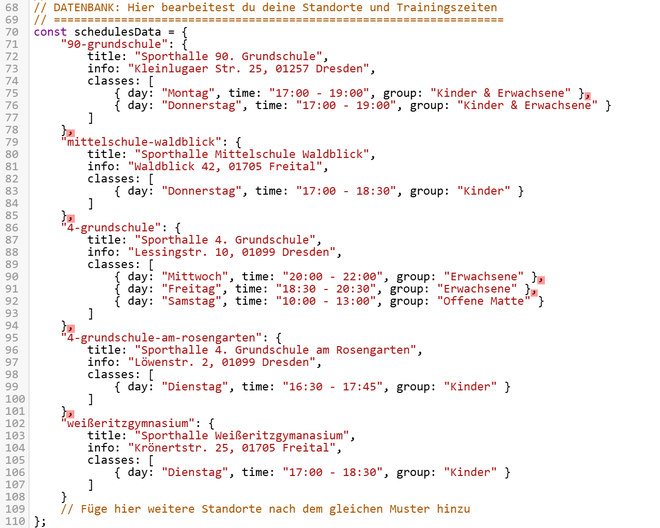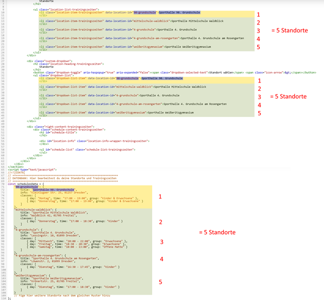 -> Jede <li> </li> Zeile (gelbgefärbt) ist ein Standort. Die schwarze Schrift (in der ersten Zeile blaugefärbt) ist die Bezeichnung die später auf der Website zu sehen ist. Die rote Schrift links daneben (auch blaugefärbt) ist eine einzigartige Bezeichnung des Standorts. Das kann halle-1, xyz oder 90-grundschule sein. Das ist völlig egal. Die Bezeichnung ist auf der Website nicht zu sehen.