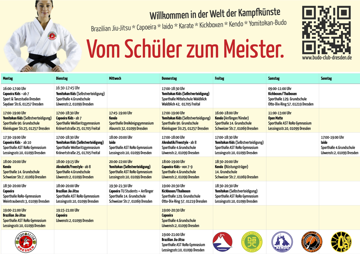 Der BUDO-CLUB-DRESDEN bietet verschiedene Kampfkünste an. Von Selbstverteidigung über Schwertkampf bis hin zu Kampfsportakrobatik. Ob Breiten- oder Wettkampfsport, für jeden ist etwas dabei. Komm vorbei und probier Dich aus. Wir trainieren in verschiedenen Sporthallen in Dresden und Freital.