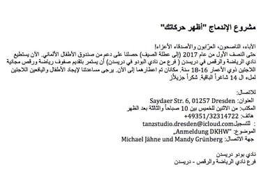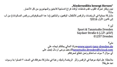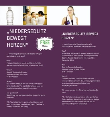 "Niedersedlitz bewegt Herzen" makes it possible for refugees and migrants of all ages to take part in sports and dance classes (except Discofox and ballroom dances) of Sport & Tanzstudio Dresden and BUDO-CLUB-DRESDEN.